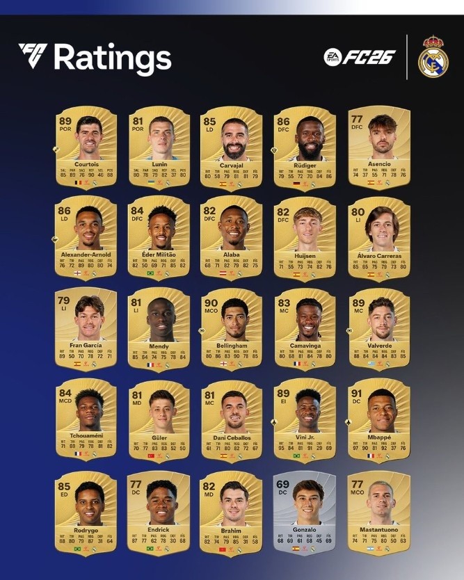 9月11日讯 FC26公布了皇马球员评分情况,姆巴佩91分最高,贝林厄姆90分次之。