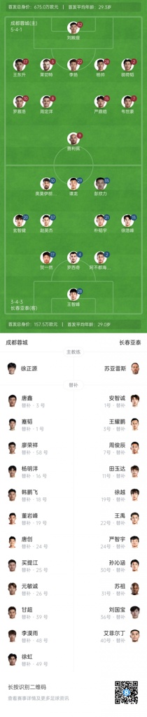 长春亚泰首发:28-王智峰、2-阿不都海米提-阿不都格尼、4-罗西奇(F)、15-徐浩峰、17-贺一然、20-玄智健、21-朴韬宇、35-彭欣力、37-赵英杰、10-奥莫伊胡安弗(F)、29-谭龙